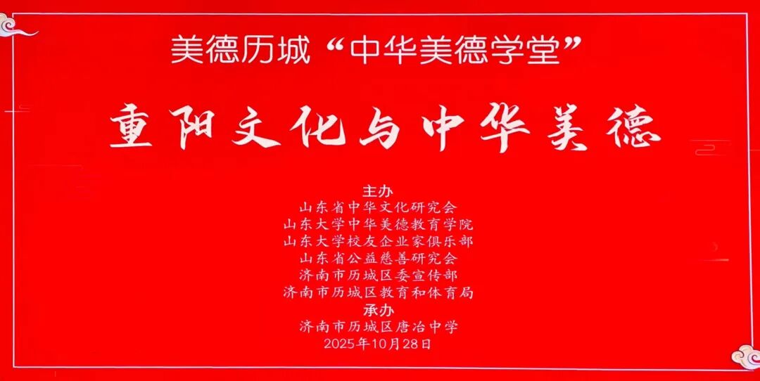 重阳节作为我国重要的传统节日,承载着丰富的文化内涵与时代价值。为弘扬中华优秀传统文化,发挥节日礼俗的教化育人功能,10月28日(重阳节前夕),由山东省中华文化研究会、山东大学中华美德教育学院、山东大学校友企业家俱乐部、山东省公益慈善研究会、济南市历城区委宣传部、历城区教育和体育局联合主办的“中华美德学堂”重阳文化宣讲活动,在历城区唐冶中学成功举办。