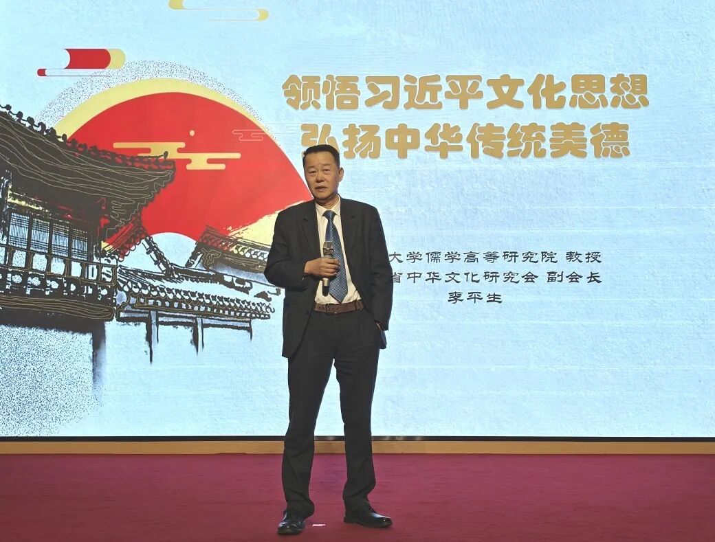 李平生作为本次活动的主讲人,他从“从百年大局理解文化自信”“领悟习近平文化思想体系”“把握中华美德时代精髓”“结合实际传扬中华文明”四大维度展开深度讲解。他指出,文化自信是“更基础、更广泛、更深厚的自信”,当前统筹中华民族伟大复兴战略全局与世界百年未有之大变局,正是推动中华优秀传统文化创造性转化、创新性发展的关键时期。