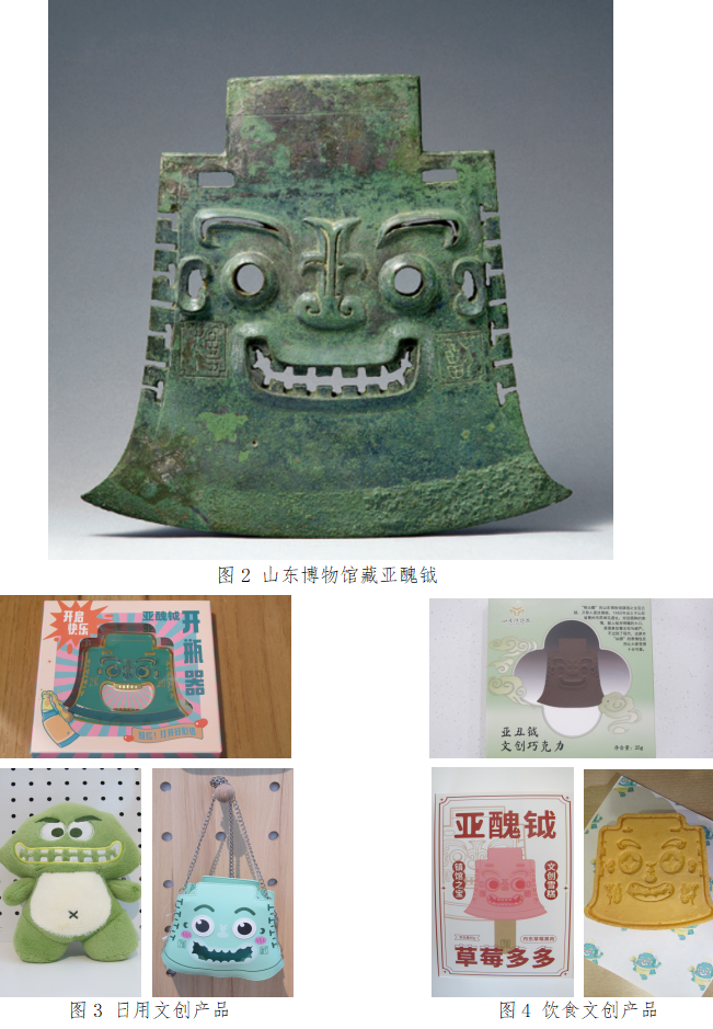 济南部分国有博物馆利用自身馆藏特色和素材开发并经营文创产品,如山东博物馆馆藏的亚醜钺(图2)是镇馆之宝之一,其是商代晚期的一种青铜兵器,也是当时权力和地位的象征,有较高身份和地位的人才能使用钺器。我们透过亚醜钺还能一窥商代的审美趣味,相较于夏代,商代青铜器装饰纹样的排列更为规律,制作工艺更为精良,造型的神秘色彩更为浓厚,这无疑都是当时人们审美情趣的体现。山东博物馆以亚醜钺为素材设计开发了一系列文创产品(如图3、图4)并进行销售推广。另外,济南部分国有博物馆还通过增加观众座椅、提供适当饮食服务、优化验证安检流程、在观众入馆通道设置遮阳挡雨设施、配备残疾人专用通道和轮椅、设置行李存放处和母婴室等便民措施进一步提高了观众参观舒适度。